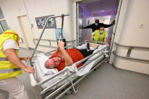 Im Saal für Heilgymnastik kümmert sich Dr. René Dondelinger um seine Patienten, die hierhin evakuiert wurden. Von Panik keine Spur. „Sollen wir gemeinsam etwas singen?“, schlägt er vor. Und sofort stimmen einige ein fröhliches „Happy Birthday“ an.