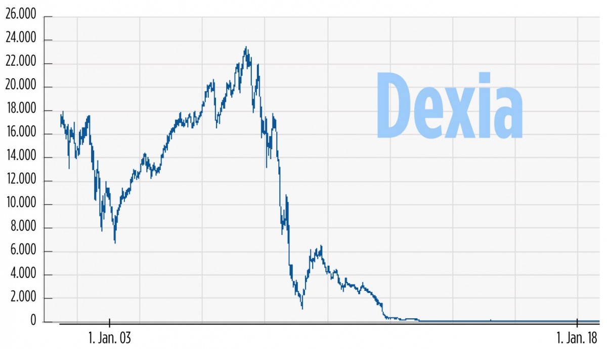 Für die Aktionäre der Dexia beträgt der Wertverlust bis heute fast 100 Prozent. Allein in den letzten Monaten ist die Aktie noch einmal um 50 Prozent eingebrochen. Hoffnung ist auch keine in Sicht. Dexia ist ein Finanzunternehmen, das keine Zukunft haben soll. Die Gruppe ist dabei, «abgewickelt» zu werden.