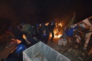 Sie rücken früh am Tage an, um «aufzuräumen»: Gendarmen mit Helmen und Schutzschilden entfernen Holzpaletten, Reifen und Felgen, die rund um einen Lagerplatz aufgeschichtet sind.