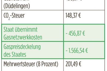 Das Endresultat ist dann, dass ein Haushalt bei einem jährlichen Verbrauch von 2.700 m3 mit den Oktober-Bedingungen 3.814,24 Euro pro Jahr nur für das Gas bezahlen muss. Durch die Preisdeckelung der Regierung fallen allerdings 1.566,54 Euro davon weg. Der Staat übernimmt seit dem 1. Mai außerdem die Kosten der Netznutzung von Privatkunden. Heißt: Die 456,87 Euro, die üblicherweise für das Gasnetz anfallen würden, bleiben aus. Schlussendlich muss der Kunde bei dieser Simulation von Enovos etwa 2.720 Euro im Jahr bezahlen.