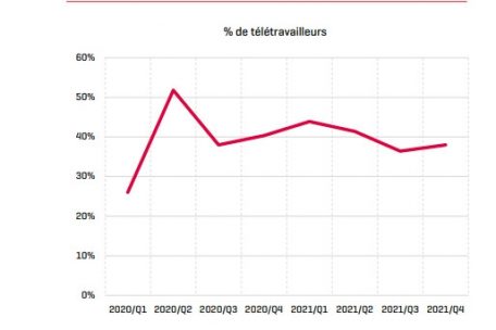 Auch auf die kürzliche Entwicklung der Arbeit von zu Hause aus geht Statec ein. Der Anteil der Beschäftigten, die Telearbeit nutzen, sei während der Corona-Beschränkungen im zweiten Quartal 2020 „explodiert“ und habe mit 52 Prozent einen historischen Höchststand erreicht. Nach diesem Höhepunkt ging der Anteil der Telearbeit etwas zurück, blieb aber auf einem hohen Niveau – etwa doppelt so hoch wie vor der Pandemie. Im Jahr 2019 arbeiteten noch 20 Prozent der Luxemburger Beschäftigten von Zuhause aus, im vierten Quartal 2021 leisteten 38 Prozent der Erwerbstätigen Telearbeit.