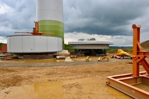 Ein leichter Wind weht am Montagnachmittag über das Plateau am „Mettendallerbësch“ nahe Bergem. Eine hellgraue Säule ragt über die Baumkronen hoch – doch der danebenstehende Kran übertrumpft die stattliche Höhe des in Bau befindlichen Windrads sogar noch. „Wir sind froh, wenn hier Wind ist, weil das zeigt, dass die Standorte gut sind, aber es bedeutet auch, dass schwere Komponenten nicht angehoben werden können, weil es zu windig ist“, erklärt Paul Zeimet, „Managing Director“ bei Soler. Dadurch komme es dann regelmäßig zu Verzögerungen. An dem Tag sollten eigentlich weitere Teile der Säule angebracht werden.
