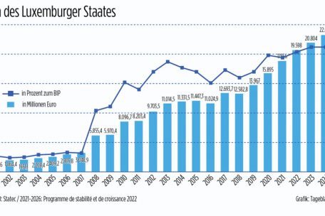 Diese Lage wird sich nun aber wieder ändern. So schreibt das Finanzministerium in dem Ende April vorgestellten „Programme de stabilité et de croissance“ (PSC), dass die Zinszahlungen Luxemburgs von 111 Millionen Euro im Jahr 2022 auf 229 Millionen Euro im Jahr 2026 ansteigen werden. Hintergrund sind jedoch nicht nur die höheren Zinssätze, sondern auch eine höhere Summe an geliehenen Milliarden.
