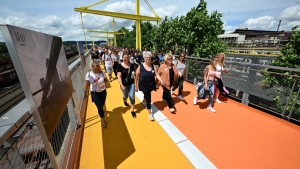 Mittwoch, 13 Uhr, an der Rampe zum „Vëlodukt“. Es ist bereits viel los. Rund 200 Menschen sind am Anfang der Fahrradbrücke in Esch eingetroffen. Mitarbeiter der „Ponts et chaussées“ verteilen Etiketten mit Nummern an die Personen, die beim Statiktest mitmachen. Die Männer und Frauen der Straßenbauverwaltung führen die Versuchspersonen die Rampe und ein gutes Stück auf die Brücke hoch. Laurent Didier, bei der Straßenbauverwaltung für die Fahrradinfrastruktur verantwortlich, erklärt die Vorgehensweise für den Test: Zuerst sollen die ersten 100 Personen gemeinsam bis zum ersten Messpunkt spazieren – und dann sollen die weiteren 100 hinterher.