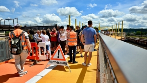Der Test sei durchgeführt worden, um das dynamische Verhalten der Brücke zu erfassen, sagt Fritz De Oliveira. Dabei gab es mehrere Szenarien: Im ersten gingen 100 Teilnehmer in einer ersten und dann weitere 100 in einer zweiten Gruppe gemeinsam über die ersten 600 Meter der Brücke. Dabei mussten sie möglichst nah beieinander laufen, um zu simulieren, dass eine große Zahl von Menschen über die Brücke läuft. Im Anschluss wurden kleinere Grüppchen gebildet, die über die Strecke gehen, beziehungsweise joggen mussten.