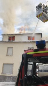 Das Feuer brach wohl gegen 10 Uhr in einem Zimmer im ersten Stock eines Mehrfamilienhauses aus und griff daraufhin auf ein Nachbargebäude über.