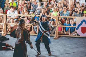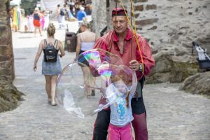 Mehr als 100 Mitwirkende bieten den Besuchern über neun Tage einen Einblick in das Leben und Treiben im Mittelalter. Händler und Handwerker bieten ihre Waren an, Ritter kämpfen um die Angebetete, Musiker und Gaukler unterhalten das Publikum. Besonders Kinder kommen auf ihre Kosten. Sie können hier wieder Spiele entdecken, die in unserer digitalisierten Welt in Vergessenheit geraten sind. Wo kann man sonst schon riesige Seifenblasen fabrizieren, mit Pfeil und Bogen schießen oder dem Schmied dabei zuschauen, wenn er das glühende Eisen bearbeitet?