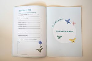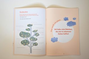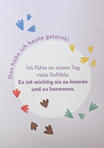 Feuerrot ist es, wenn es wütend ist. Blau steht für traurig, Gelb für froh und Braun für ängstlich. Dann hockt es unerkannt zwischen den gleichfarbigen Ästen der Bäume, wo es sich gut verstecken kann. Wenn Mama und Papa aufhören zu streiten, wird es grün, weil es entspannt ist. Die einfachen Geschichten und Mitmachaktionen, die das Booklet anbietet, eröffnen Kindern die Chance, sich zu öffnen.