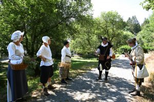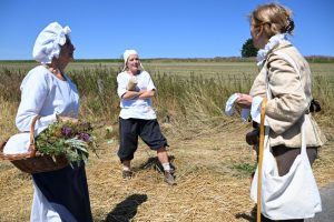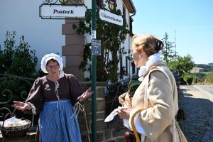 „Huppe Ketti“ ist hingegen die Gelassenheit in Person. Bei den Hauben, die sie näht, muss jeder Stich sitzen und die Ohren bekommen alles mit. Kaum ein Tratsch, den sie verpasst. Was die Poststation für den geschriebenen Austausch ist, ist die „Haubenfrau“ für den von Mund zu Mund. Später tauchen die Bauersfrau Scheiffer Sis und der Lehrbub im Steinbruch auf dem fünf Kilometer langen Weg auf und stellen Szenen des Lebens vor 500 Jahren nach. Und irgendwie wirken so manche Sachen so gar nicht „historisch“, sondern höchst aktuell.