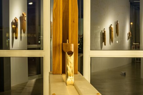Hoch ragen die hölzernen „Wächter“ hinauf, gekrönt von einem mal polierten, mal unpolierten Kopf – vielleicht einem Helm – aus Stahl bzw. Bronze mit einem Innenleben. Denn die Wächter haben ein Herz, eine Kapsel, die man herausnehmen kann wie eine Matrjoschka-Puppe oder ein Tabernakel. In dieser Kapsel befindet sich u.a. ein Stein (meist ein Turmalin, der Schutzstein gegen negative Energien) oder auch Baumsamen. Damit schließt sich auch wieder der Kreis, der in allen Skulpturen von Brandenburger eine wesentliche Rolle spielt. Derselbe darstellerische Grundgedanke kommt auch in den ringförmigen Gebilden wieder, wovon einige in der Ausstellung präsentiert werden, als Sinnbild einer Linie ohne Anfang und Ende, d.h. des endlosen Kreises.