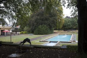 "Haaptwuecht" (ganz links), Auguste Trémonts Hirschkuh vor dem Schwimmbecken und im Hintergrund die Überreste eines Musikkiosks