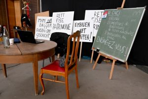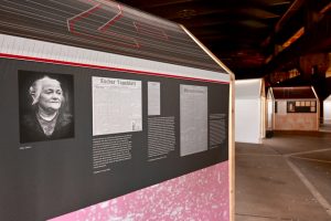 In der großen, dunklen Stahlwerkhalle stehen derweil 26 hell beleuchtete Häuschen. Sie alle haben ein Thema und sind von A wie Angscht bis Z wie Zetkin nach den Buchstaben des Alphabets geordnet. Beleuchtet werden unterschiedlichste Aspekte, von der Arbeit im Haushalt, der Kindererziehung oder aber „typische“ Frauen-Berufe bis hin zum politischen Engagement. Allesamt mit einem direkten Bezug zu Luxemburg und dem Minett. Zum Beispiel steht das W für Wiertsfra und das D für Germaine Damar, dem in Petingen geborenen Star im deutschen Film der 1950er Jahre. Außen an den Häuschen wird das Thema erklärt, während sich im Inneren ein Objekt befindet, das es zusammenfasst, zum Teil auch auf skurrile Art und Weise. Zusammengestellt wurde „Fraen am Minett“ von den Künstlern Marie-Paule Jungblut und Thomas Ebersbach.
