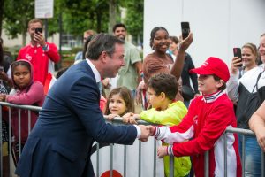 Doch dann, fast wie auf Kommando, klärte es langsam auf und Bürgermeister Georges Mischo konnte den hohen Besuch vor dem Escher Theater gebührend in Empfang nehmen. Von der kleinen – und mutigen – Liv gab es Blumen für Prinzessin Stéphanie. Diese schien sich zu freuen. Irgendwo erklangen, von rot-weiß-blauen Fähnchen begleitet, „Vive“-Rufe. Freundlich gewunken wurde auch. Hüben wie drüben.