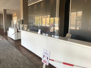 In der Lobby des Légère Hotel in Münsbach mit seinen 156 Zimmern herrscht gähnende Leere. Ein Absperrband sorgt für sichere Distanz zur Rezeptionistin, die hinter einer Scheibe Telefonate entgegennimmt. Audrey (43) und David (34) sitzen alleine in der Empfangshalle. Die beiden Franzosen arbeiten in einem Altenpflegeheim in Bartringen und leben vorübergehend hier.