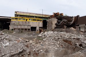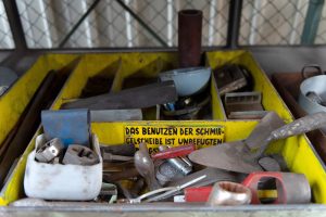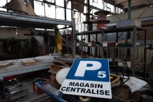 In der Gegenwart führt der Weg an überwucherten Bahnschienen entlang in Richtung Hauptportal. Es ist der 1. Mai und die in zwei Gruppen aufgeteilten Besucher sammeln ein wenig Gestrüpp auf. Während im Museum die Geschichte der „Metzeschmelz“ Revue passieren gelassen wird, binden die Mitglieder des Ferro Forum daraus den Maikranz, der anschließend fast drei Stunden lang quer über das Areal getragen wird. Denn im früheren Stahlwerk gibt es viel zu sehen und das braucht Zeit. Ende 2011 hatte ArcelorMittal die Stilllegung auf unbestimmte Zeit verkündet. Die Arbeiter und Angestellten gingen davon aus, ihren Job bald wieder aufnehmen zu können, weshalb es nun, zehn Jahre später, dort aussieht, als wäre der Ort fluchtartig verlassen worden. Aktenordner liegen herum, genau wie persönliche Gegenstände der Belegschaft. Und natürlich jede Menge Arbeitsmaterial. Und Schrott. Auf dem Weg durch das Areal wird etwas klarer, was die Mitglieder des Ferro Forum so machen. Obwohl sie schon x-mal hier waren, finden sie immer wieder neues Material, was sie als erhaltenswert betrachten. Es wird eingesammelt. Diese „Ressourcerie“ geschieht quasi nebenbei. Und sie ist ein Wettlauf mit der Zeit, denn die Abrissarbeiten im Inneren haben schon begonnen. Viele Dinge werden so der Nachwelt erhalten und ins Herzstück des Ferro Forum gebracht, das Atelier.