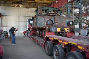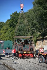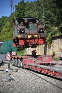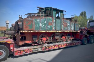 Kurz nach Mittag und bei strahlendem Sonnenschein wurde die Elektrolok ADU N. 6 gestern von einer belgischen Spezialfirma mit einem Kran auf einen Anhänger gehoben und dann per Schwertransport nach Düdelingen gebracht.  Die Route führte durch Differdingen, dann ging es weiter über die Südautobahn A13 bis nach Düdelingen. Der Transport ging ohne Schwierigkeiten über die Bühne und die Spezialisten brauchten nicht mal eine Stunde, um die Strecke zu bewältigen.