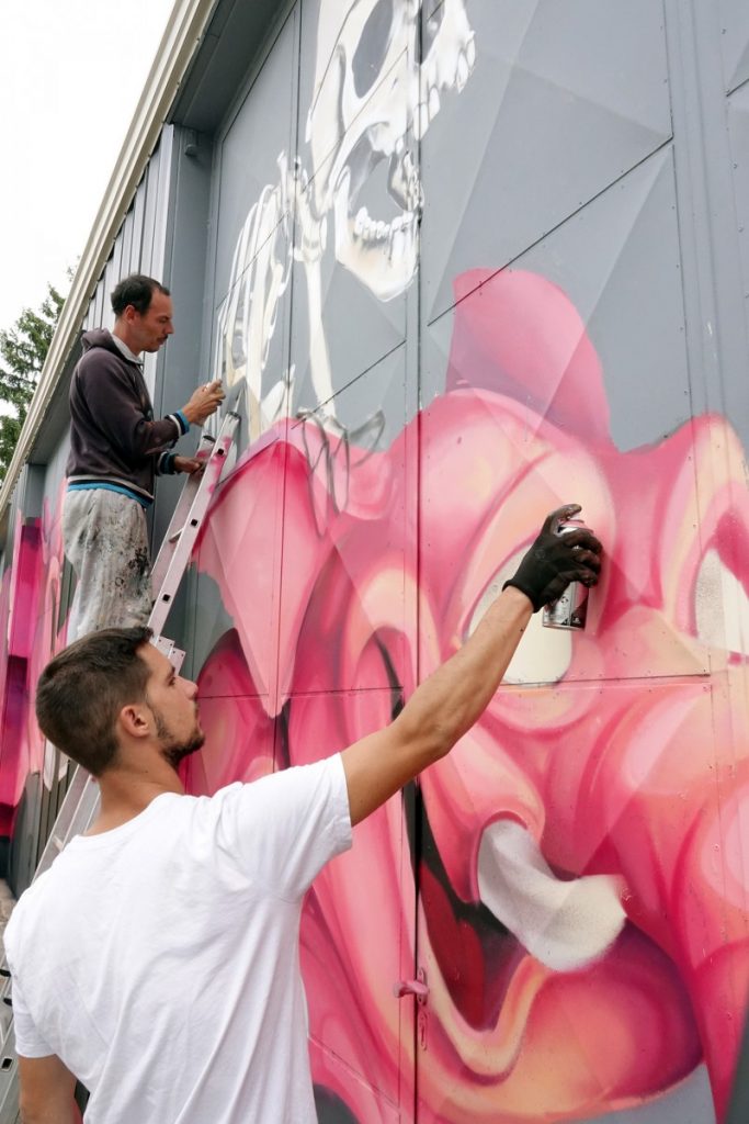 «Das lag mir schon lange am Herzen», erklärt er uns, als wir uns mit ihm und mit Michi Mentgen von der Leudelinger Kulturkommission im Ortszentrum treffen, wo zurzeit emsig gearbeitet wird. Gerade sind Abys und Scaf, zwei bekannte Graffiti-Künstler aus Frankreich, damit beschäftigt, einen Teil der tristen Lagerhallen mit ihren farbenfrohen Motiven zu verzieren. Dabei handelt es sich um das einstige Feuerwehrlokal am Dorfplatz. «Gut zwei Jahre lang hat die Kulturkommission am Konzept gearbeitet», erzählt der Schöffe, «und nun ist es endlich so weit!»