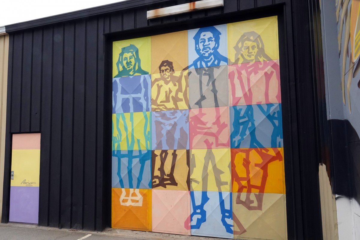 Nach dem Abstecher im Inneren begeben wir uns nach außen zu den alten Hallen, die genau wie die Häuserzeile, an die sie angrenzen, in mehr oder weniger naher Zukunft einem Projekt zur Neugestaltung des Dorfkerns weichen werden. Hier sind gerade die beiden französischen Künstler Abys und Scaf dabei, ihr gemeinsames Werk zu realisieren. Die knallbunten Figuren von Abys harmonieren dabei auf eigensinnige Art mit den Totenköpfen von Scaf.