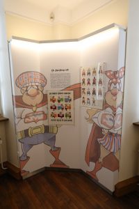 Auf alle Details der Ausstellung einzugehen, ist unmöglich, da die Fülle der gezeigten Details überwältigend ist. Neben zahlreichen Zeichnungen sind auch Exponate zu sehen wie z.B. eine Land- und eine Stadtkarte mit den Orten, wo Superjhemp überall agierte, die speziell für die Ausstellung angefertigt wurden.