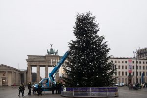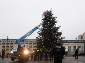 Auf einer Hebebühne rollten zwei Personen am Pariser Platz in Berlin-Mitte ein Transparent mit der Aufschrift „Das ist nur die Spitze des Weihnachtsbaums“ aus, wie eine Polizeisprecherin sagte. Dann seien sie bei der Protestaktion am Mittwochmorgen mit der Hebebühne zum Wipfel der 15 Meter hohen Nordmanntanne gefahren.