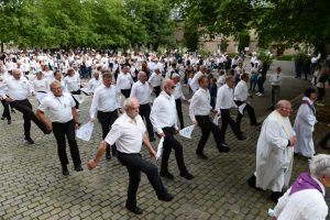 Auch wenn die Besucherzahlen seit Jahren rückläufig sind, so ist die Springprozession doch weiterhin fest im Kalender vieler Echternacher, aber auch vieler ehemaliger Schüler, eingetragen. Dass die Springprozession mehr als nur eine religiöse Prozession ist, bewiesen die vielen mit weißen Hemden und dunklen Hosen bekleideten Menschen jeden Alters, die sich auch in diesem Jahr wieder in kleinen Gruppen rund um die verschiedenen Kneipen und Plätze versammelt hatten. Am Pfingstdienstag gleicht das beschauliche Städtchen stets dem Schauplatz eines großen Konveniats. Studenten kehren an jenem Tag ihren Universitäten den Rücken, Arbeitnehmer nehmen sich an diesem Tag frei, um noch einmal dorthin zurückzukehren, von wo aus sie nach ihrem Schulabschluss in die weite Welt hinauszogen. Wie man hört, sollen einige den Pfingstdienstag sogar in ihrem Arbeitsvertrag ausgehandelt haben. Alte Freunde aus Lyzeumstagen können sich bei der Springprozession eines Wiedersehens sicher sein.