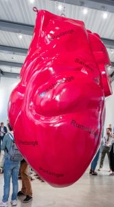 Gleich im ersten Raum der Galerie bietet sich ein ungewöhnlicher Anblick: ein rotes, dreidimensionales Herz, mindestens zwei Meter hoch und an einem Stahlseil von der Decke hängend. Die imposante Plastik aus Fiberglas und Lack vom Künstler-Duo Floriane Soltysiak und Tom Flick heißt „Corrubrum“. Was so viel heißen könnte wie Herz und Körper – d.h. das organische Zusammenwirken von allen an der Kulturhauptstadt 2022 teilnehmenden Südgemeinden und ihren französischen Nachbargemeinden, deren Namen auf dem gigantischen Herz eingetragen sind.