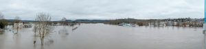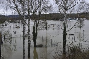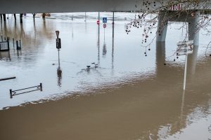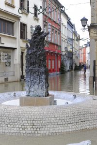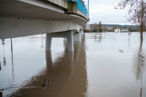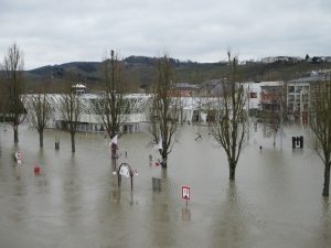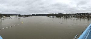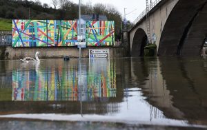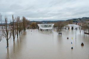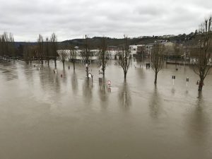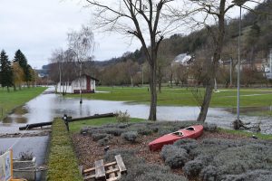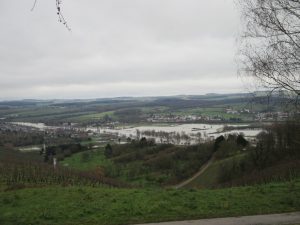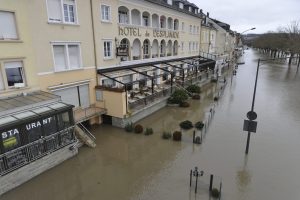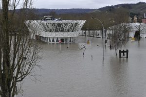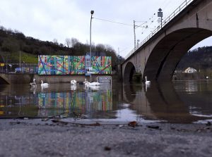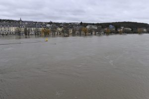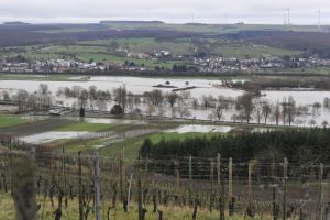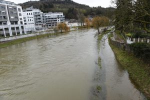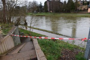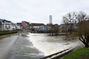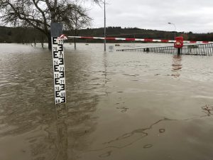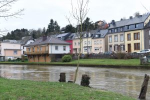 Wenn man den Berg hinab nach Remich fährt, ist der Weg nach rechts ins Zentrum hinein abgesperrt, sodass man nur noch über die Brücke Richtung Deutschland fahren kann. Wer von hier aus auf die Mosel herabschaut, dem wird erst einmal bewusst, wie hoch das Wasser gerade steht und wie reißend der Fluss ist. Das neue Bahnhofsgebäude sowie die Eispiste, die auf der «Esplanade» in einem Zelt aufgebaut wurde, stehen knietief im Wasser und auch auf der deutschen Seite der Mosel sieht es nicht besser aus.