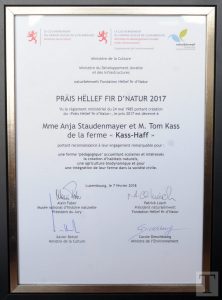 «Egal, ob eine Mutter mit Kinderwagen über den Hof geht und ihrem Kind die Tiere zeigt, oder ob eine Schulklasse kommt, um den Arbeitsalltag am Hof mitzuerleben: Unser Ziel ist es, so viele Menschen wie möglich hier zu haben, damit sie sich mit unserer Idee verbinden können», erzählt Tom Kass. Etwas außerhalb des Dorfes hat er mit seiner Frau Anja Staudenmayer den gemeinsamen Traum einer biodynamischen Farm verwirklicht. Der Hof ist ein Vorzeigebeispiel für andere Landwirtschaftsbetriebe. Dafür wurden Tom und Anja am vergangenen Mittwoch auch mit dem diesjährigen «Präis Hëllef fir d’Natur» ausgezeichnet.