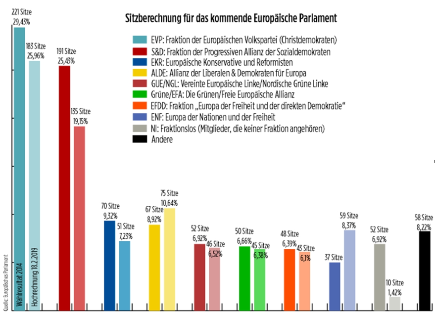 Das Europäische Parlament wird bis zu den Europawahlen, die vom 23. bis 26. Mai stattfinden werden, regelmäßig Hochrechnungen über die Sitzverteilung im künftigen Parlament veröffentlichen. Aus den am Montag vorgelegten Zahlen geht hervor, dass die Europäische Volkspartei (EVP) die stärkste Kraft im Parlament bleiben wird, gefolgt von den Sozialdemokraten (S&D) sowie den Liberalen (ALDE). Die europäische Volksvertretung wird sich aufgrund des EU-Austritts Großbritanniens künftig nur mehr aus 705 anstatt wie bisher 751 Abgeordneten zusammensetzen. Ein Teil der britischen Sitze wurde auf 14 andere EU-Staaten verteilt.