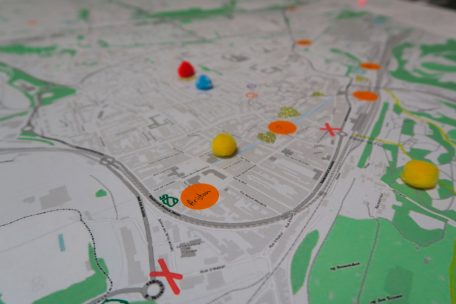 La seconde partie de l’atelier approvisionne également la carte interactive et l’audio-guide. Mais il concourt aussi aux travaux académiques des géographes du groupe Remix Place. Cette fois, ce sont des grandes cartes qui servent à stimuler les souvenirs. Les participants sont invités à y localiser des lieux de leur mémoire. „Ce qui nous intéresse, ce sont les lieux qui comptent pour leurs habitants. En tant que géographes, on s’intéresse beaucoup à la manière dont les aménageurs pensent l’espace“, explique Estelle Evrard. „Mais ce qui nous intéresse également, c’est de voir comment les habitants dans les lieux ressentent les choses. Ce qui est important aussi, c’est ce que cela crée en termes de communauté, de vie, d’échanges, d’attachement à des lieux, et pourquoi on agit d’une certaine manière dans un territoire donné.“