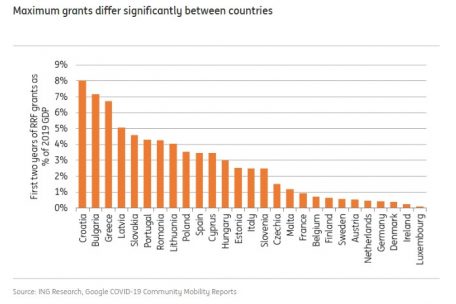 Der Verteilungsschlüssel für die ersten zwei Jahre und für 70 Prozent des Fonds orientiert sich laut ING-Artikel an den Bevölkerungszahlen sowie dem Pro-Kopf-Bruttoinlandsprodukt von 2019 und der Arbeitslosenrate 2015 bis 2019. Was so viel heißt, dass die wirtschaftliche Leistung und nicht die Auswirkung der Corona-Krise auf die Wirtschaft der entscheidende Faktor bei der Berechnung der Hilfen ist. Bei den anderen 30 Prozent, die 2023 ausbezahlt werden, wird die Arbeitslosenrate durch das Wachstum des Bruttoinlandsproduktes während der Corona-Krise ersetzt.