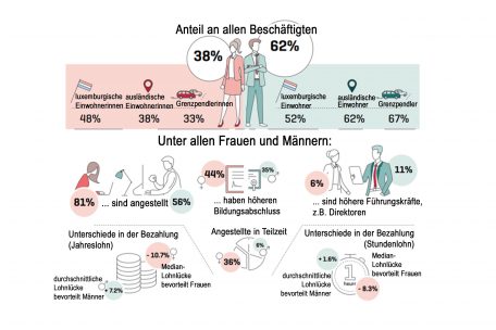 Zunächst ist aber festzustellen, dass in Luxemburg ohnehin nur relativ wenige Frauen überhaupt angestellt arbeiten: Sie stellen derzeit 38 Prozent aller Beschäftigten, während diese Quote EU-weit nahe der goldenen Mitte liegt, nämlich bei etwa 48 Prozent. Tatsächlich liegt die Quote bei den einheimischen Luxemburgerinnen auch genau da, nämlich bei 48 Prozent. Erst die ausländischen Einwohnerinnen ziehen ihn herunter (unter ihnen beträgt der Anteil nur 38 Prozent) und bei den Grenzgängern sind die Männer sogar mit 67 Prozent in der Mehrzahl.