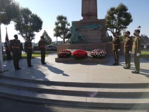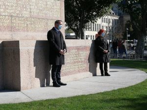 Nächste Etappe ist die „Gëlle Fra“. Die langsam größer werdende Menschenmenge bewegt sich in Richtung place de la Constitution. Dort erinnert Paca Rimbau-Hernández, die Präsidentin der „Association des amis des Brigades internationales“, in ihrer Rede an die Opfer und die Tragödie des Spanienkriegs von 1936 bis 1939. Der Platz ist mittlerweile recht gefüllt. Hier und da sieht man Menschen, die interessiert die Zeremonie mit ihren Handykameras festhalten. An der Rückseite des Mahnmals enthüllen Bettel und Rimbau-Hernández eine Inschrift: Ein kräftiger Ruck an der Luxemburger Fahne, die das Novum bedeckt, und die Inschrift, die an die freiwilligen Kämpfer im Spanischen Bürgerkrieg erinnern soll, liegt frei. Das politische Viergespann stellt sich vor dem Monument nebeneinander in einer Reihe auf und legt einen weiteren Blumenkranz nieder. Ende von Zeremonie Nummer drei.