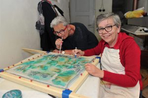 So auch im Keramiksaal, wo alle konzentriert den nassen Ton bearbeiten. Seitlich stehen einige Arbeiten zum Trocknen, Glasieren oder Brennen im eigenen, quasi fabrikneuen Ofen bereit. Übrigens ist das Töpfern gratis und das Material wird gestellt. Die Seidenmalerinnen ihrerseits haben sich im Seitengang installiert. Alle haben sich vor etwa 30 Jahren bei Kursen in Strassen kennengelernt und sich nach deren Einstellung dem «Art libre» angeschlossen. Sie beherrschen das Metier aus dem Effeff und finden heute Gefallen am Experimentieren. «Wir haben z.B. Rasierschaum und andere Materialien ausprobiert. Hier sehen Sie ein Seidentuch, das mit einer Wäscheklammer bemalt wurde», erklärt Gisèle Hentges. Besonders stolz sind die Seidenmalerinnen auch auf ihre Fixiermaschine, die einzige im Land.