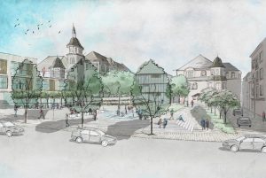 Die place Kons ist ein Platz, wo traditionell viele Touristen hinkommen. Überdacht mit Wasserbecken und -spiel, Bäumen und Bänken wirkt er im Plan wesentlich einladender als die heutige Betonfläche. Geplant ist ein Hotel am Platz mit offener Lobby und Cafés. Die Übernachtungsmisere entlang der Mosel ist schon lange ein Thema. Von der place de la Résistance mit dem Rathaus gibt es ein altes Foto.