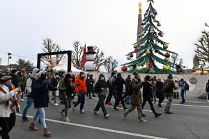 Bei der „Gëlle Fra“ sichert eine Reihe Polizisten den Weihnachtsmarkt vor den Demonstranten ab. Dieses Mal kommt es nicht zu Szenen wie vor zwei Wochen, als Protestler den Markt stürmten. Am Casino vorbei biegt der Demonstrationszug nach rechts in den Boulevard Royal und folgt ab dort den Tramschienen – und stört damit den Verkehr.