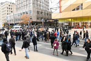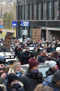 Eine weitaus größere Gruppe – zwischen 400 und 500 Personen – hat sich dagegen am Bahnhof versammelt. Mit Megafonen, Trommeln und Pfeifen ausgestattet machen sie sich in Richtung Glacis auf. Dabei rufen sie immer wieder „Liberté, Liberté“ oder „Mir sinn d’Vollek a mir si fräi“. Die Protestler ziehen durch die avenue de la Gare und über das Viadukt in Richtung Stadt, begleitet von einer Vielzahl an Polizisten, die den Verkehr regeln und mit den Demonstranten Schritt halten. Bengalos und Böller werden angezündet. Es ist ein lauter Protest, der Aufmerksamkeit erregt.