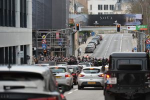 Dennoch macht sich kurz darauf eine größere Gruppe von Menschen auf den Weg Richtung Innenstadt. Sie kommt allerdings nicht weit, denn die Polizei stellt sich ihr in den Weg und blockiert die Straße. Dort stehen sich schließlich Polizei und Demonstranten gegenüber – die Stimmung ist angespannt. Unter den Augen einiger Schaulustiger skandieren die Demonstranten „la police avec nous“ und „mir si fräi, mir si fräi“.