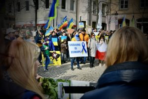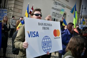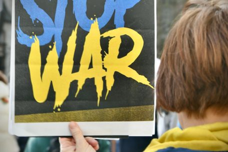 Die Protestler hissten Plakate mit verschiedenen Anti-Kriegs-Botschaften und Forderungen wie etwa „No-fly zone for Ukraine“, „Stop war“, „Ban Russia from Visa, Mastercard, Swift“ oder „Ukraine is Europe“.