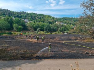 So gelang es den Wehren aus Langsur, Trierweiler, Trier-Land, Newel und Igel nach einiger Zeit, den Brand unter Kontrolle zu bringen und ein Übergreifen auf den Wald zu verhindern. Und das bei Temperaturen über 30 Grad und einer glühenden Sonne, die den ehrenamtlichen Rettungskräften die Arbeit nicht erleichterte. Im Gegenteil: Die Wasserversorgung konnte vor Ort nur mit einer Saugleitung an der Sauer gewährleistet werden. Doch sind die Ufer an dieser Stelle wegen des starken Wildwuchses nur schwer zugänglich.