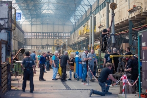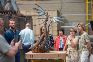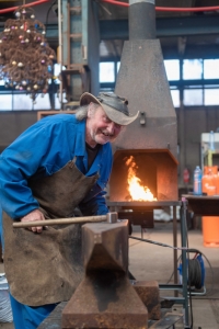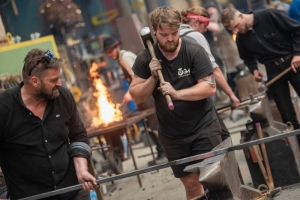 Zahlreiche Besucher fanden am Wochenende den Weg in die Werkstätten der Ferroforum Asbl. Hier boten die Veranstalter einen echten Einblick in die Arbeit des Schmieds. Rund 40 Schmiede aus dem In- und nahen Ausland führten den Besuchern ihre Künste um das Eisenschmieden vor. Im Mittelpunkt der Veranstaltung stand die Schaffung eines gemeinsamen Kunstwerks, vor Ort geschmiedet und zusammengenietet. Spätestens beim Anblick der Schmiedearbeiten zum schätzungsweise zwei Meter hohen Gemeinschaftswerk wurde einem bewusst, wie viel Muskelkraft, aber auch Präzision ein Schmied aufbringen muss. Alle geschmiedeten Einzelteile waren genauestens aufeinander abgestimmt. Mithilfe eines Werkstattkrans bauten die muskulösen Handwerker ein Gerüst zusammen, bestehend aus Seitenteilen und einer Mittelstange. Langsam nahm das bestehende Gemeinschaftswerk, eine Riesenschaukel, Form an. Bis zur Fertigstellung floss noch viel Schweiß. Am Sonntag gegen 12 Uhr wurde das Werk vor Ort offiziell eingeweiht.