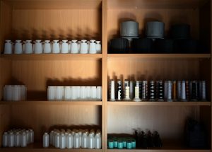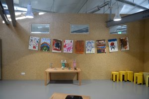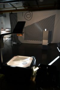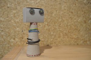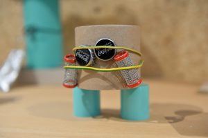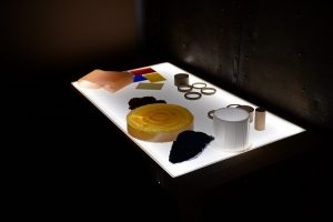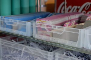 Hinter den Regalen liegt eine kleine Ausstellungsfläche. Hier zeigt Lynn Schammel, wie man die polierten Abfälle auf vielfältige Weise einsetzen oder mittels Lichtinstallationen in Szene setzen kann. Sie hat Design studiert und leitet den Materialbereich. Im «Labo» bietet sie zusammen mit ihren Kollegen Workshops für Kinder an, bei denen sie zeigt, wie man zum Beispiel ganz ohne Kleber mit Abfallmaterialien basteln kann.