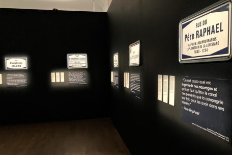 Pour sa première exposition (mais sa deuxième institutionnalisation après la récupération d’une œuvre critique sur Dubaï par le ministère de la Culture), le collectif „Richtung 22“ ne fait toujours rien comme les autres. Il fait entrer en novembre au Casino – Forum d’art contemporain ce qui est son terrain de jeu habituel, à savoir l’espace public, l’endroit désigné pour concourir à la transformation de la société par la réflexion à laquelle il aspire. Les rues Christophe Colomb, Courdenhove-Kalergi et l’avenue Jean-Pierre Pescatore ont désormais pour point commun d’avoir fait leur entrée au musée, comme symboles d’une célébration de personnalités qui ont profité allègrement du colonialisme quand elles ne l’ont soutenu sinon appliqué avec cruauté. Huit panneaux de rue au total sont ainsi accrochés dans la Black Box du Casino, éclairés et expliqués comme des œuvres. L’action questionne aussi la notion du vol et de la restitution des biens usurpés dans les territoires colonisés. Le collectif rappelle à ce titre que la Villa Vauban abrite une collection, celle de Pescatore, qui doit beaucoup à l’exploitation d’esclaves sur les plantations de tabac cubaines au XIXe siècle. (Jérôme Quiqueret)