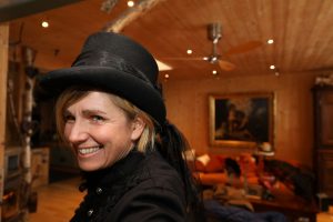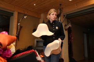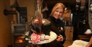 Ihre Faszination dafür stammt aus Alice im Wunderland. Einmal ist sie, als verrückte Hutmacherin verkleidet, zu einer Weihnachtsfeier mit dem Thema Walt Disney gegangen, mitsamt Perücke und lebendigem Kaninchen. Dazu kommt, dass sie viel zu Pferd unterwegs ist. Sie findet, dass Hüte gut zu den Vierbeinern und zu Kutschen passen. Ihr erster selbst gemachter Hut war ein schwarzer Zylinder mit hellen Rosen und Federn. „Der ist zu hart und zu steif, um ihn wirklich tragen zu können“, sagt die 47-Jährige.