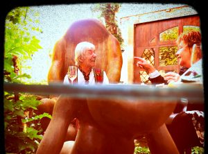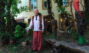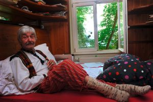 Crocks über dicken Wollsocken, weißes Hemd mit verziertem Mao-Kragen, rote Stoffhose, farbenfrohe Wollweste. Buschiger Schnauzbart plus graue Zausematte. Am Handgelenk eine kleine schwarze Tätowierung, am Finger ein Ring mit einem blauen Auge. Dann hatte er auch noch einen seltsamen Namen. Wie muss es eigentlich heißen? „Wil“ oder „Will“? Denn man sieht ja beides. „Ach, mit der Zeit wird alles kürzer.“ Ah so. Am Klingelschild stand aber  „Will“. „Ja? Wie gesagt, man wird bescheidener und verkürzt sich.“ Klar.