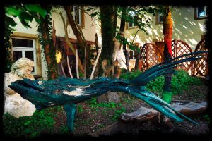Hinter dem unscheinbaren Eisentor in der rue Saint-Ulric verbarg sich ein Refugium. Hier stand die Zeit still. Es war ein mosaikhafter Kokon aus amazonasartig wuchernden Bäumen, ungemähten, Kopfsteinpflaster-umrundeten Grasflächen, scheinbar zufällig abgestellten Kunstobjekten. Da waren zum Beispiel ein Tisch, dessen Glasplatte auf einem Tarantelkörper aus Holz ruhte, zwei regenbogenfarbene Schildkröten, gefährlich anmutende Fische aus Holz mit scharf emporragenden Flossen, handförmige Holzsitze. Irgendwo zwischen zwei Bäumen lugte die hagere Gestalt des „Blannen Theis“ hervor, links daneben ein Bildnis von Lofys Großmutter Anna, auf einem Tisch eine Auswahl an Muscheln.