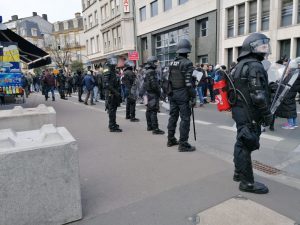 Einige Demonstranten haben den „Korridor“ verlassen und sind die Avenue de la Porte Neuve in Richtung Stadt gezogen. Polizisten mit Helmen und Schutzschilden blockieren die Straße.