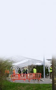 Mehrere metallene Strukturen werden aufgebaut, ziemlich große. Es sind Zelte. Drei sind es insgesamt – wie viele es werden sollen, erfährt man am Freitagnachmittag nicht. Informationen gibt es vor Ort überhaupt keine. Keine beflissenen Pressesprecher in Sicht. Warum eigentlich nicht? Angst vor Ansteckung? Ach ja, richtig, die Öffentlichkeit interessiert sich ja gar nicht an diesem Coronadings. Quatsch! Es scheint eher so, als ob Regierungsvertreter sich nicht wirklich an dem interessieren, was Bürger wissen wollen und wissen sollen – oder?