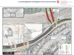 Im Rahmen der Arbeiten wird die rue des Scillas zu einem vierspurigen Boulevard ausgebaut. Bei der dortigen Tennisanlage entsteht ebenfalls eine Tramhaltestelle. Da die Tram teilweise entlang der Häuser in der rue Auguste Scholer fahren wird, muss dort ein Schallschutz errichtet werden. Um die Sicherheit der Fußgänger zu gewährleisten, werden in Höhe der neuen Tramhaltestelle sowie gegenüber dem Tunnel „Rangwee“ Verkehrsampeln aufgestellt.