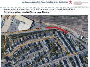 Apropos Fußgänger: Auch diese werden von den Arbeiten betroffen sein, da vom 4. bis zum 17. April der „Rangwee“ zwischen der rue du 9 Mai 1944 und der rue des Scillas gesperrt ist. Der Umweg verläuft über die rue Auguste Schroeder.